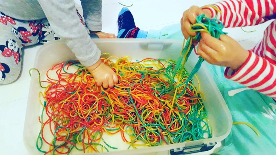 Activități pentru bebeluși: joc senzorial cu spaghetti colorat