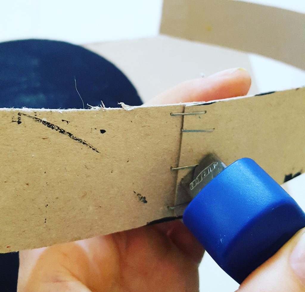 Măsurați diametru cercului și tăiați două fâșii de carton (sau una mai mare) de aceeași dimensiune. Pentru a le uni, folosiți capsatorul.