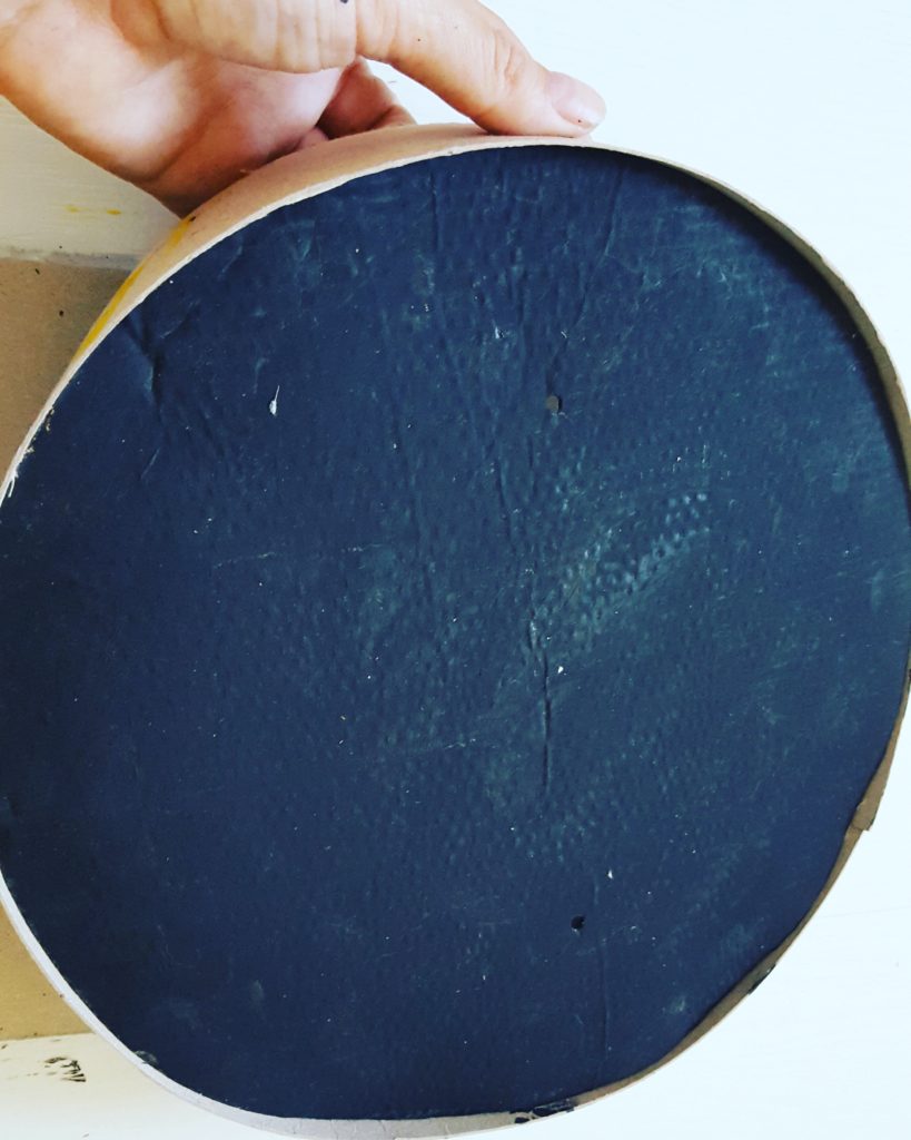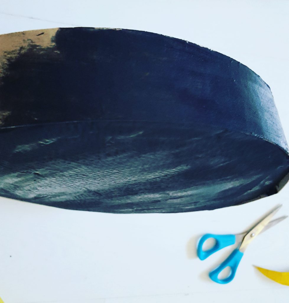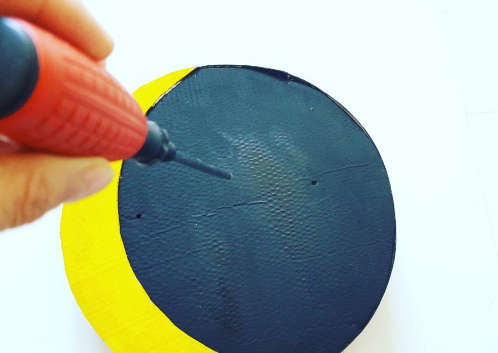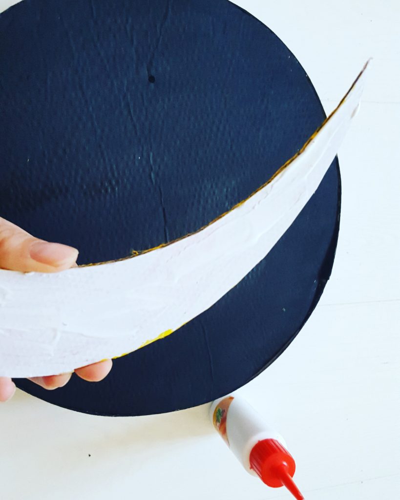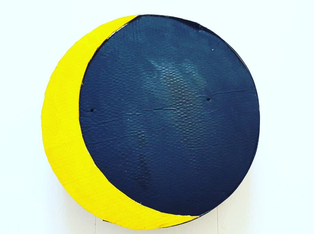 Am pictat cercul cu negru și luna cu galben. Am lăsat să se usuce bine. Puteți da mai multe straturi, pentru că sigur cartonul absoarbe mai mult pigment. Eu am dat trei straturi.