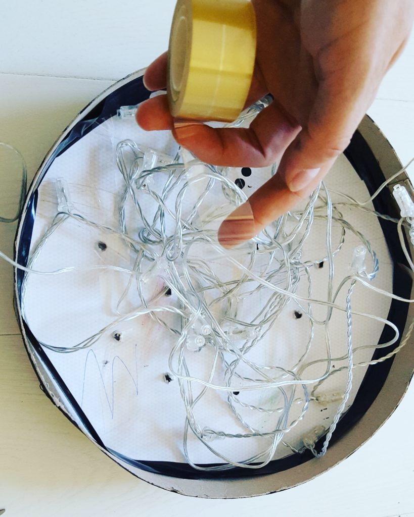 Lipiți în interior, în zona în care se unesc, bandă izolantă de culoare neagră. Aceasta va face să nu se disperseze lumina prin crapaturi și să se vada frumos stelele.