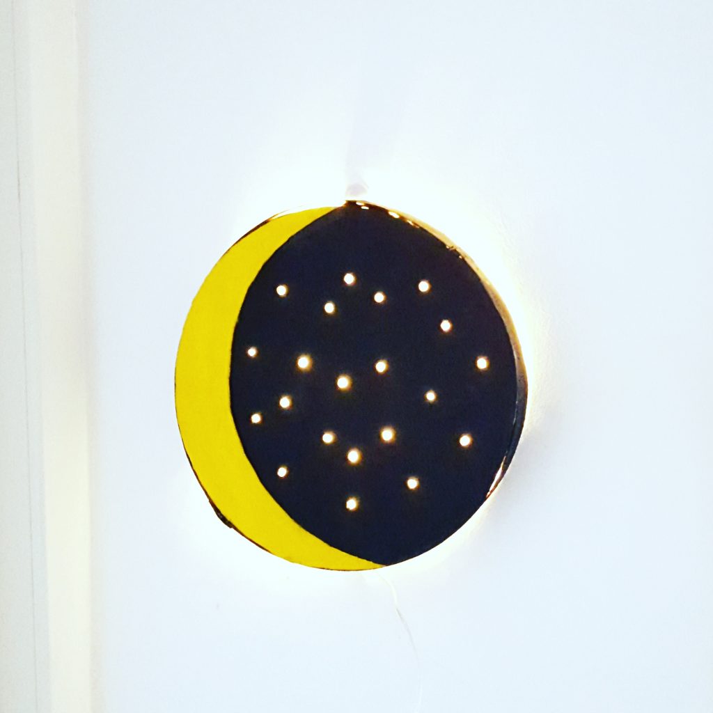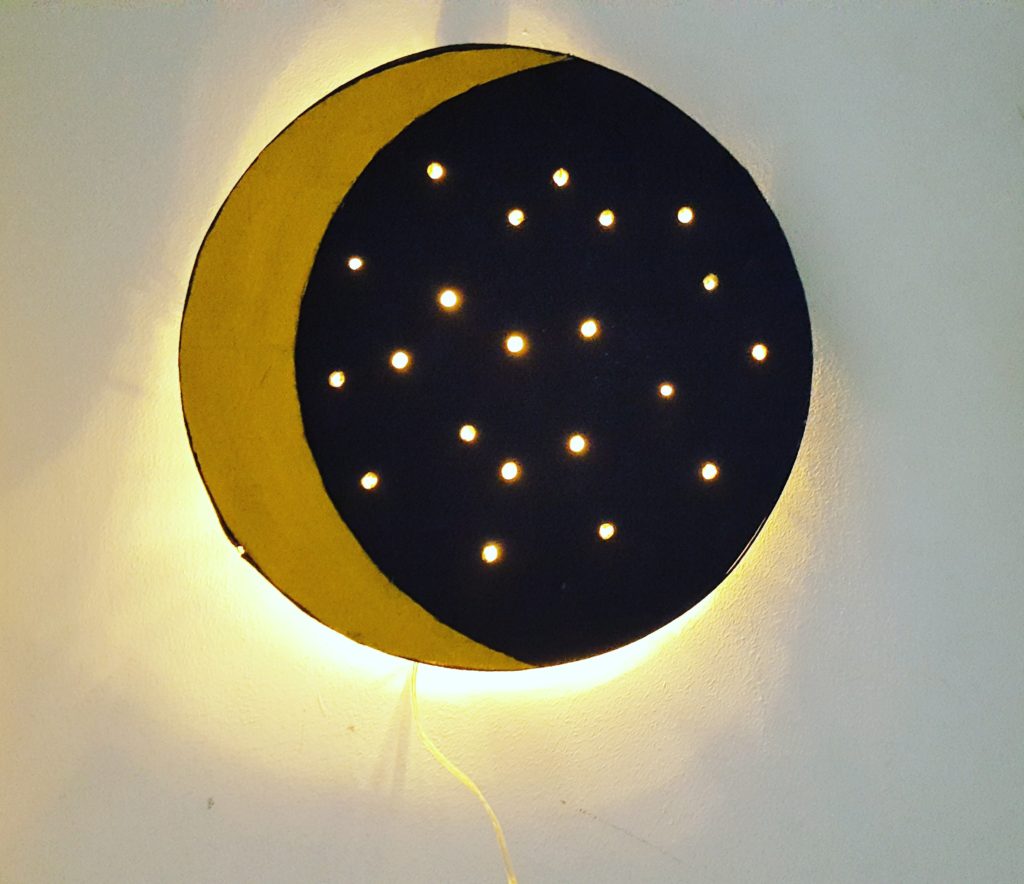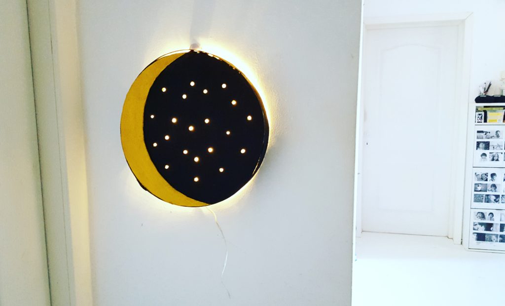 Pierdută-n lumea mare, a oamenilor mari, înstrăinată-n veci de copilărie și de părinți, sufletul meu caută uneori puritatea de atunci. Iar pentru asta, am gândit să aduc puțin din cerul de copil în camera copiilor mei. Așa că am creat această lampă din carton, cu lună și stele.